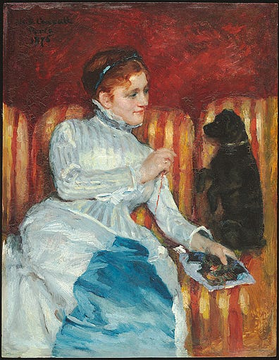 Woman with Dog, Pierre Bonnard, 1981. Wikimedia; Woman on a Striped Sofa with a Dog, Marie Cassatt, 1876. Wikimedia; Mme. Charpentier and her children, Pierre-Auguste Renoir, 1878. Wikipedia